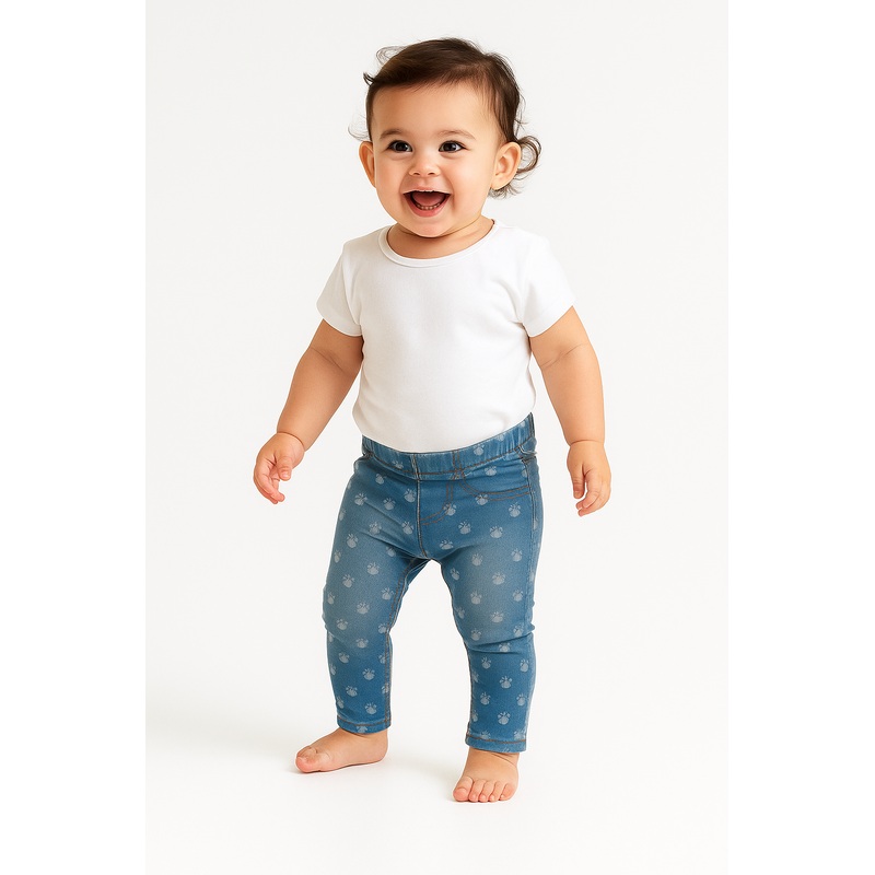 Mango Baby Girl's Blue Denim Printed Pant These Mango Baby Girl's Blue Denim Printed Pants feature cute paw print designs, perfect for your little one. Made with high-quality denim, these pants offer both style and durability. Add a touch of fun to your ba