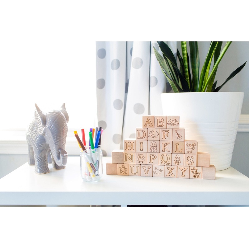 - 26 blocks have a capital on one side and corresponding picture permanently laser engraved on the back.