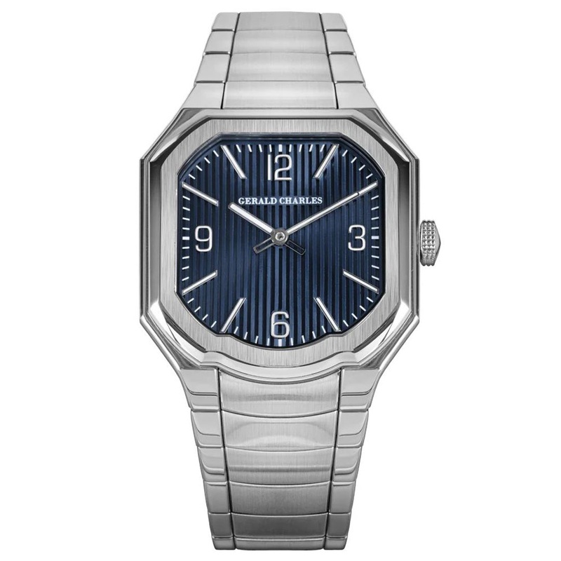Strap: Bracelet exclusively developed in-house, proprietary design by Gerald Charles. 316L stainless steel, medical grade. 3 sizes: 157 mm (small), 205 mm (medium) and 222 mm (large). Micro-link available for finer adjustment of bracelet. Polished and satin-brushed finishes. Folding clasp with hexagonal plate, engraved with GC