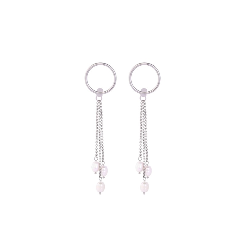 A circle-shaped front with a chain and pearl drop attached to the backing. You can pair it with a different backing to create a simple, everyday look. Post earring Length: approx. 3" including chain drop Matte Rhodium/gold, pearls Lead-free, Nickel-Free, C