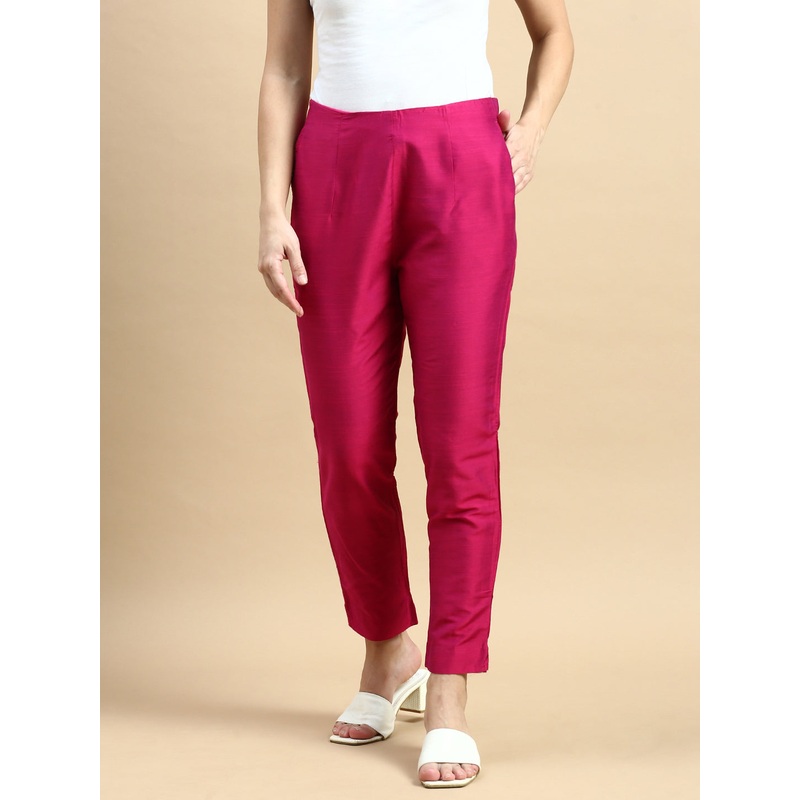 De Moza Women's Cigarette Pant Fuchsia Pattern: Solid Color: Fuchsia Rise: Mid Fit: Regular Fit Length: Ankle Style: Ethnic Wear Product Material: Polyester The featured elements include elastics and pull on closure. This style has side and slit pockets, a