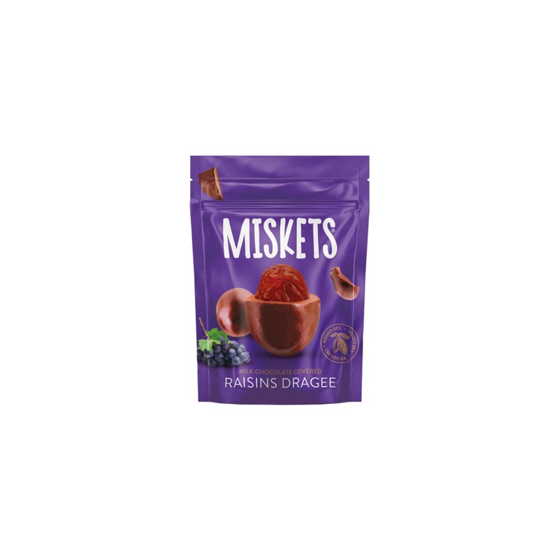 Miskets Milk Chocolate Raisins Dragee 70g Enjoy the perfect blend of sweet and smooth with Miskets Milk Chocolate Raisins Dragee. This 70g pack features plump raisins coated in creamy milk chocolate, creating a delicious snack that combines natural fruit s