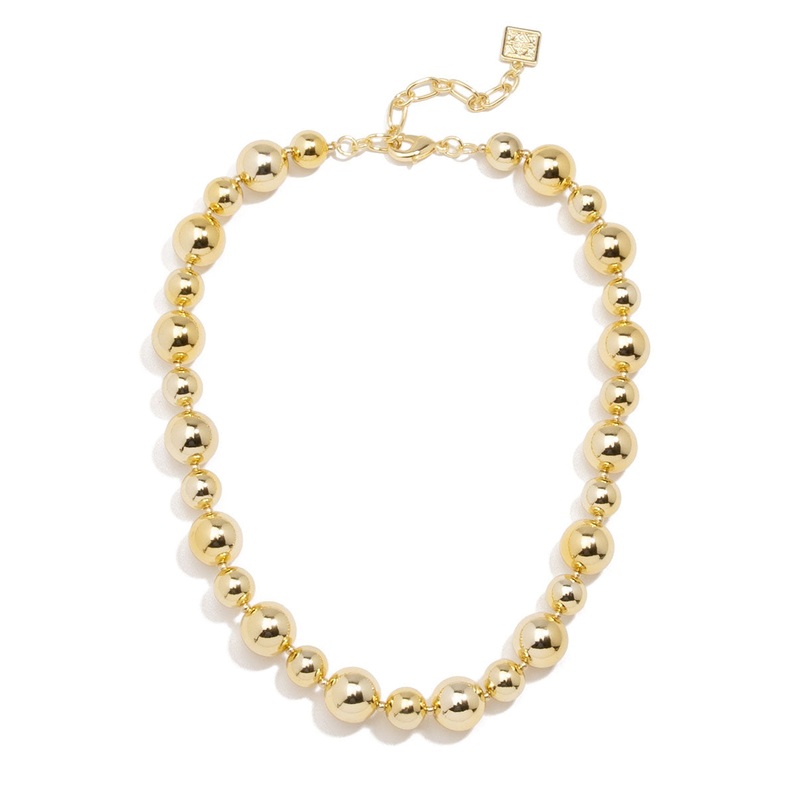 Collar necklace of multi-size resin beads finished with metal-plating and a lobster claw closure. Gold: 18K Gold Plated Silver: Rhodium Plated -Lobster Claw -19" Length -Large Beads: 20MM -Small Beads: 10MM -3" Extension -Nickel and Lead Compliant (Hypoall