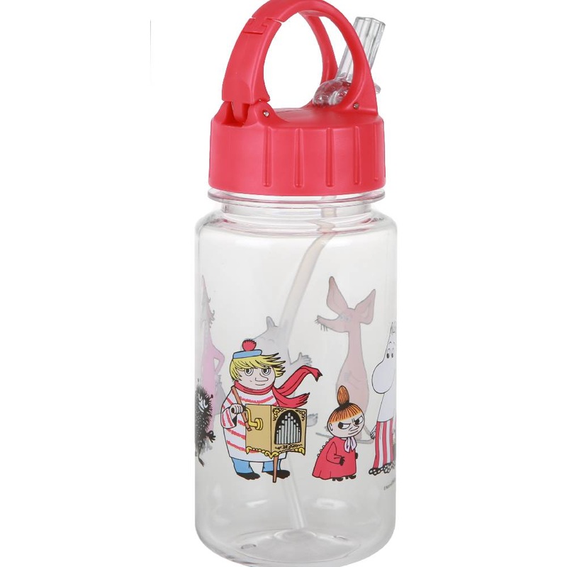 In English A water bottle decorated with an illustration of Moominvalley characters gathered together. I wonder if they are going somewhere, if a great adventure is about to begin or if they are waiting for a treat from Moominmamma. Either way, it's always