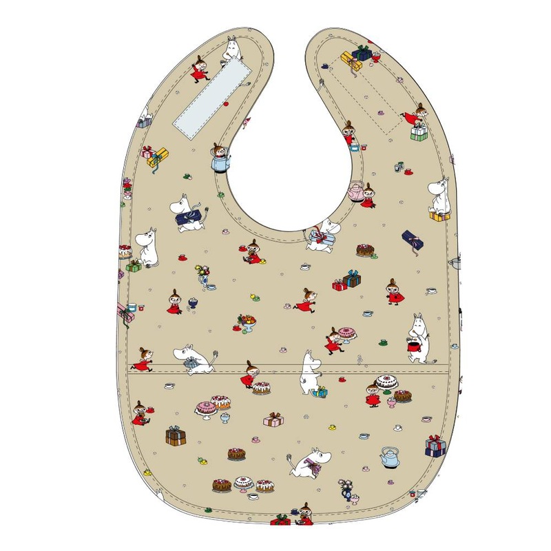 Praktisk haklapp med Muminmotiv som skyddar klder frn smuts och spill. Fickan fram samlar upp den mat som kanske annars skulle hamna p golvet. Den fsts enkelt med ett kardborreband i nacken. Haklappen r tillverkad i PU-behandlad tervunnen polyester som r ett mjukt och sknt material. Torka av haklappen med en trasa eller sklj under rinnande vatten efter varje anvndning. Materialet r snabbtorkande och efter bara en kort stunds hngtork r den p nytt redo att anvndas. Kan ven maskintvttas vid tuffare flckar. Materialet r certifierad enligt ko-Tex Klass 1 Baby vilket stller hga kemiska krav p innehll och frskrar att produkten inte innehller ngra skadliga mnen. Sktselrd: Tvttmaskin 30 grader. Material: PU-Coated Polyester (Oeko-Tex certified, Klass 1 Baby). Mtt: 38.5 x 27.5 x 2 cm. lder: +6 mnader.