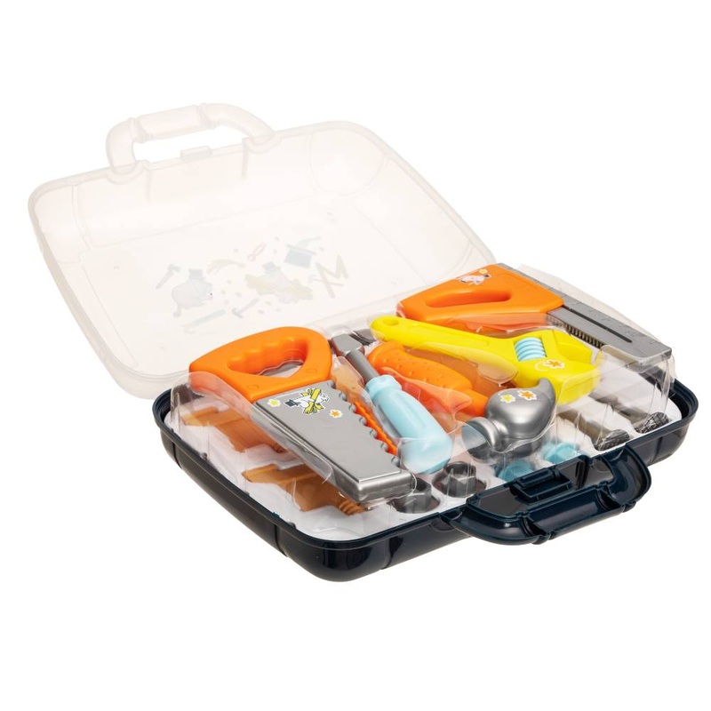 Inside the handy plastic briefcase are all the tools a little builder needs. Inside the briefcase there is a saw, a screwdriver, a hammer, a measuring tool and a wrench. In the second layer there is also a wooden bench with holes and some nuts and bolts. T