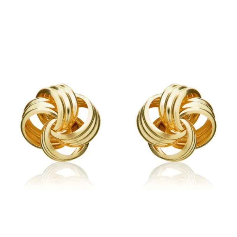 Knot style stud earrings with ribbed loops set in 9ct yellow gold, with a post and butterfly fitting. Width: 9mm