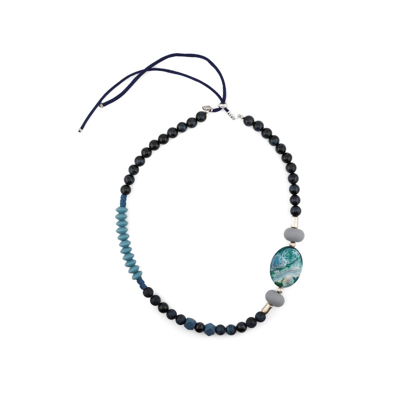 The Cobalt Necklace features black and blue tiger eye beads paired with soft silicone beads for a comfortable wear. A large agate dragon vein bead serves as a striking focal point, adding bold, natural charm to your look. Adjustable Full Length: approx. 34