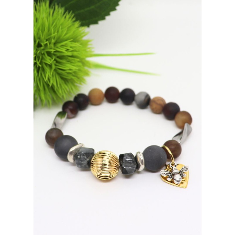 This beaded stretch bracelet combines large gold brass beads, chiseled jade, and round stones with mixed metal accents for a rustic fall look. A charming dangle featuring a heart and bee adds a delicate touch. Perfect for layering or wearing alone. Stretch