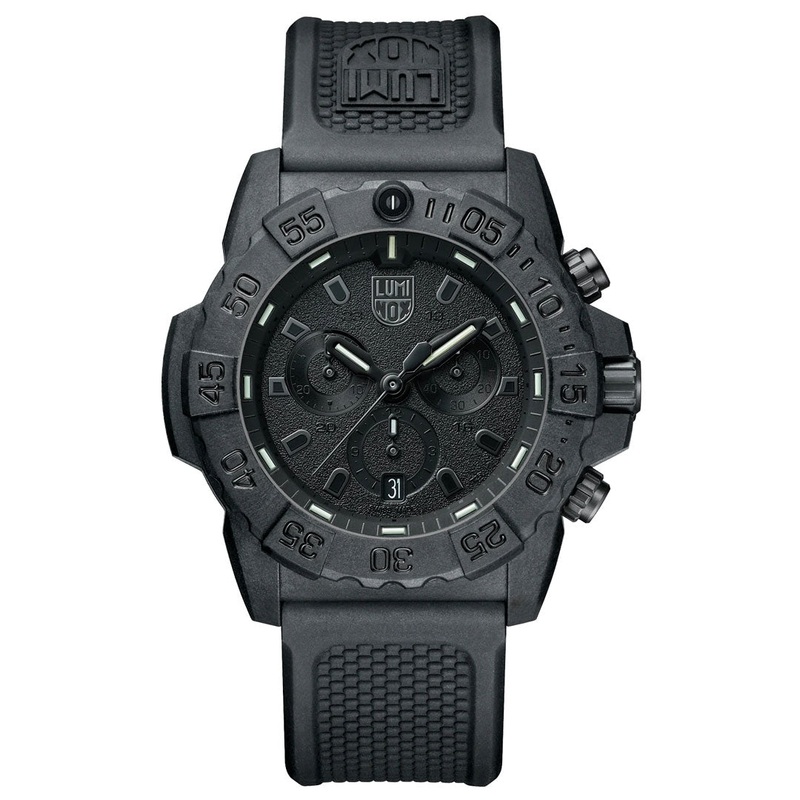 The Luminox Navy SEAL chronograph has a captivating 45-mm CARBONOX case, dive bezel and water resistance up to 200 meters; the military can be used for diving. This modern black-in-black dial is equipped with the proven Luminox Light Technology lighting system. “Always Visible”, self-powered, for up to 25 years.