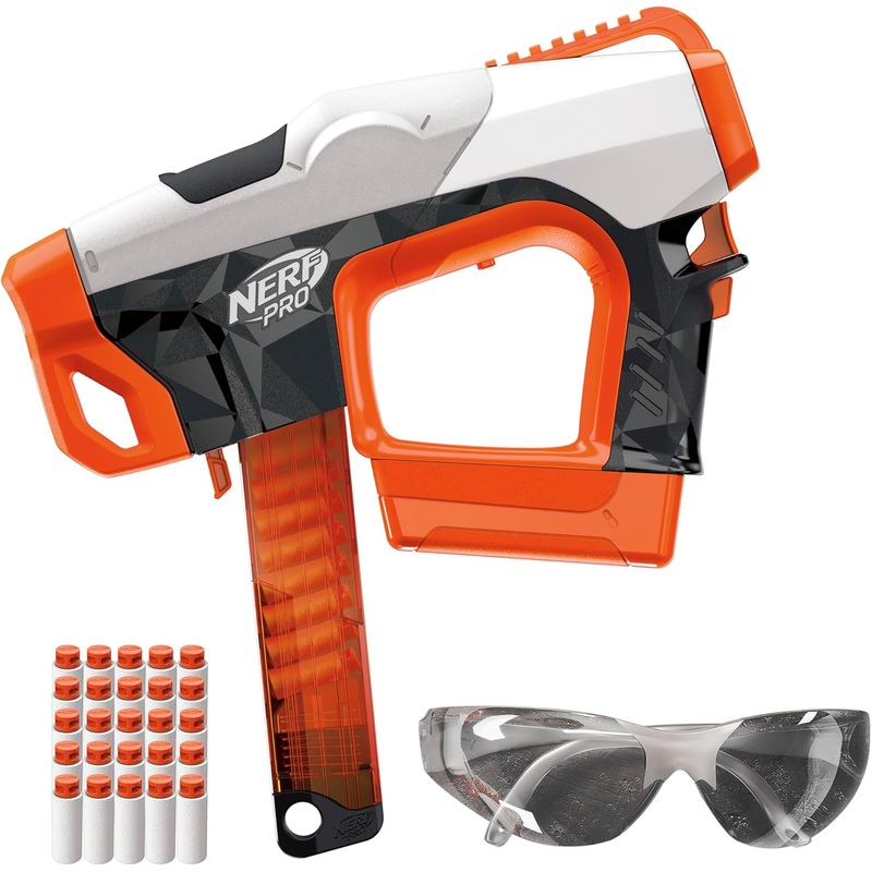 Nerf Pro Sender Half-Length Semi Automatic Dart Blaster NERF PRO SENDER BLASTER FOR COMPETITION-LEVEL GAMES: The high performance Nerf Pro half-length dart blaster is designed for Nerf athletes to compete in pro-level games. Ages 14 and up SEMI AUTO BLASTI