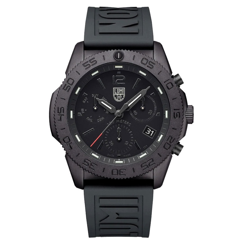 The new fully blacked out Pacific Diver Chrono is a beautiful addition to the Chronograph series. Defined by a stainless steel case, CARBONOX, unidirectional bezel, a vital instrument for any diver on a black cut to fit rubber strap allowing for an easy an