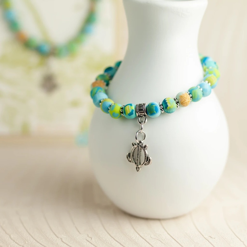Whether you or someone you know is commemorating a special vacation or celebrating a favorite island paradise, this themed beach gift bracelet is sure to bring smiles with reminders of surf, sun, and sand. Handcrafted 6mm polymer clay beads Beach-themed si