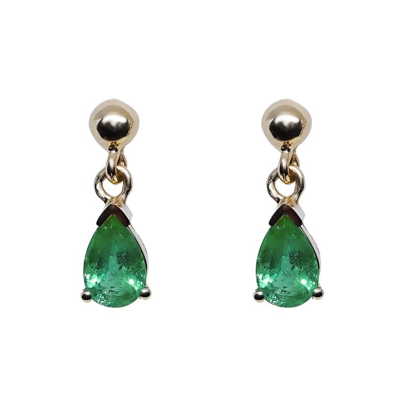 Drop earrings in 9ct yellow gold with a post a butterfly fitting. Set with a 6mm x 4mm pear cut emerald.