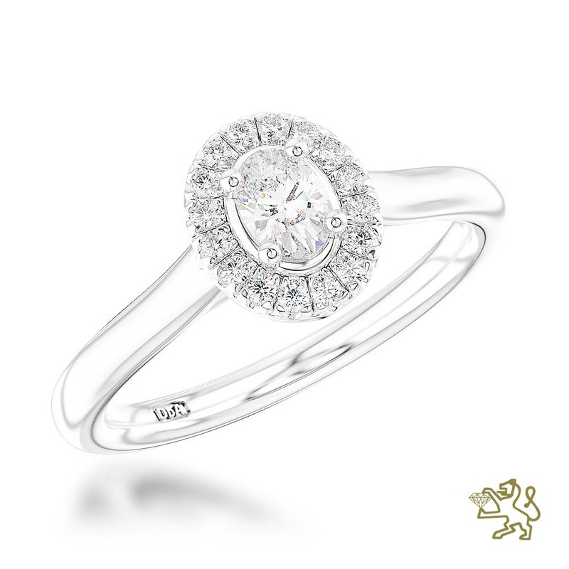 Platinum Halo An oval cut Diamond and Diamond Cluster surrounded by smaller round brilliant cut diamonds on a Platinum Plain Band. In a classic scalloped Skye settingThe halo of diamonds enhances the size of the certificated centre diamond, creating a true