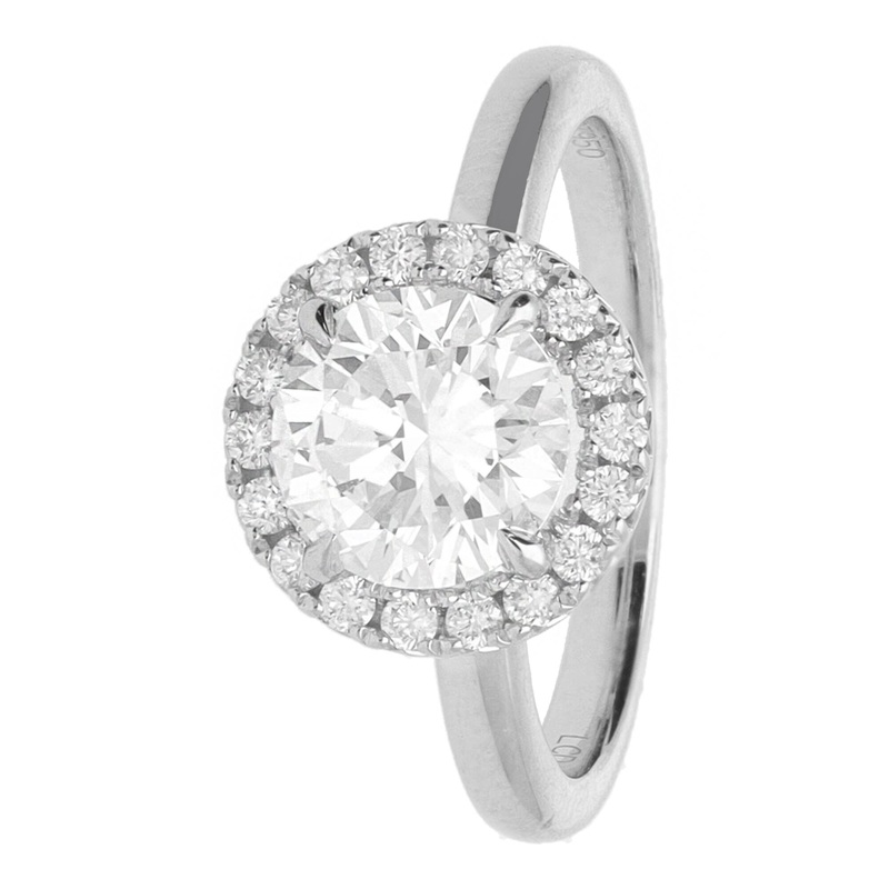 Exquisitely crafted in platinum, this captivating halo ring showcases a dazzling 1.98 carat round brilliant cut laboratory grown diamond. The central stone is beautifully framed by a halo of smaller diamonds, enhancing its sparkle and creating a timeless,