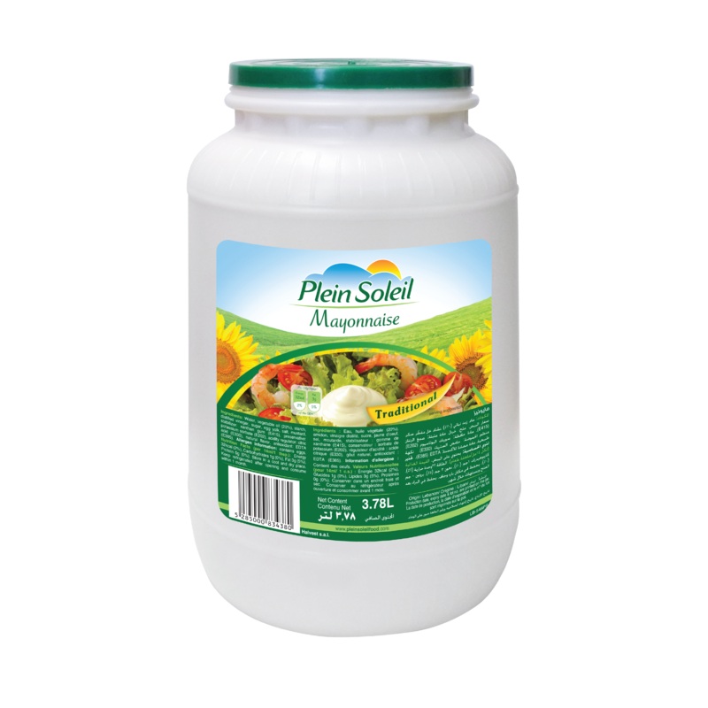 Plein Soleil Mayonnaise 3.78L Plein Soleil's Mayonnaise is ideally used as a topping in sandwiches, hamburgers or directly on French fries. Storage: Store in a dry and cool place. Store in refrigerator after opening.
