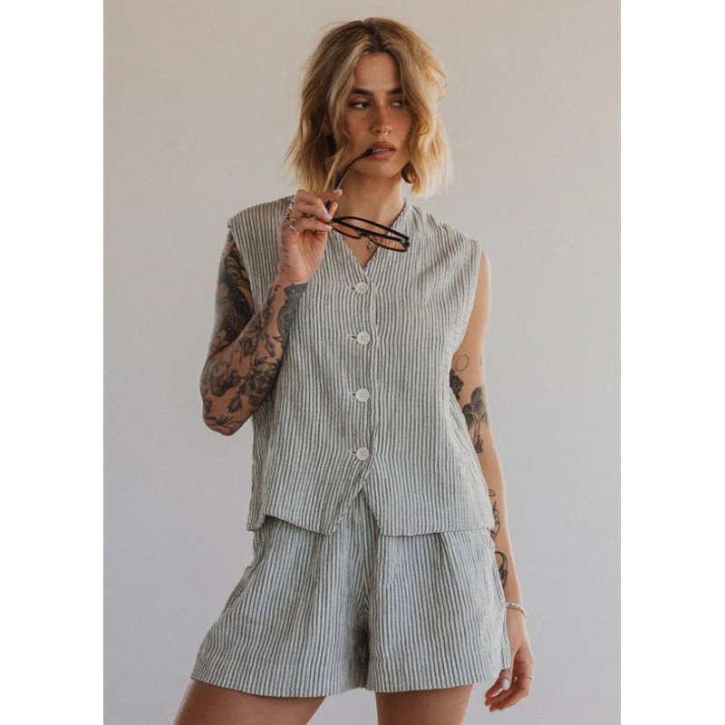 This vintage-inspired, waistcoat blends classic charm with contemporary style. Featuring a relaxed, boxy fit, white buttons to close and a crinkled finish. A playful addition to your capsule wardrobe, this piece brings a refined yet unique touch to any outfit.