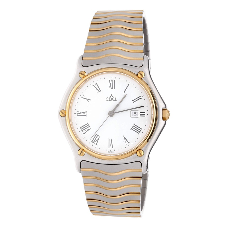 All our pre-owned watches are serviced and refinished where possible and all come with a 12 month guarantee. This classic Ebel watch has a white roman dial with a date feature. Stainless steel case and yellow gold bezel with screw details. Wave form bracel