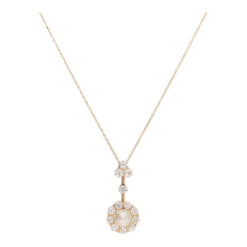 A timeless treasure from a bygone era, this pre-owned Victorian pendant features a luminous central pearl encircled by a delicate halo of sparkling diamonds. Set in a beautifully detailed antique gold mount, it hangs gracefully from an elegant chain. A per