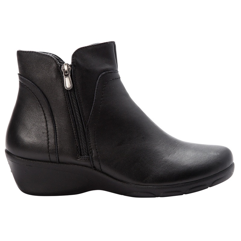 Propet Women's Black Waverly Ankled Boot Ride the style of the Waverly boot. Full-grain leather uppers with a round toe. Ankle-high bootie with dual side zippers for an easy on-and-off. Soft and breathable fabric linings. Durable PU wedge. Durable rubber o