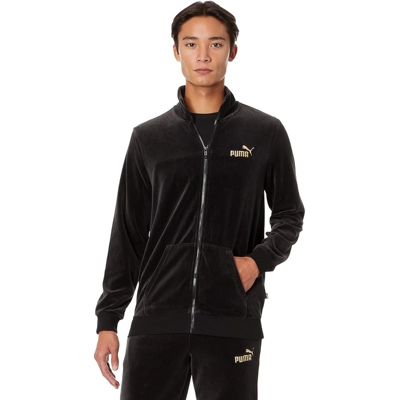 Puma Men's Black Gold Trimmed Velour Track Jacket Material composition 75% Cotton, 25% Recycled Polyester Care instructions Machine Wash About this item Regular Fit FOREVER BETER: Made with at least 25% recycled material as a step toward a better future. E