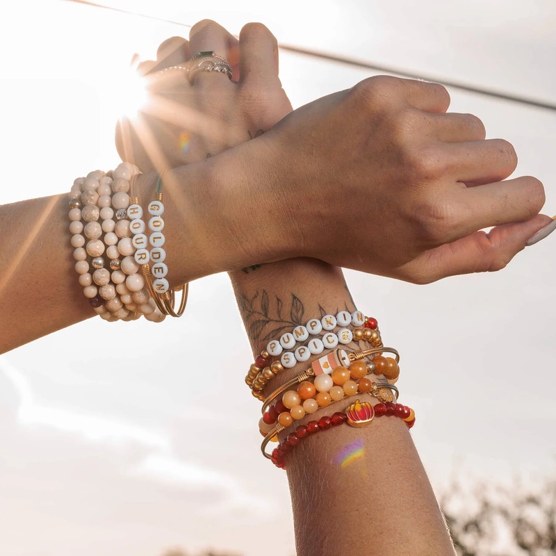 Experience the joy of autumn with the Pumpkin Spice Stretch Bracelet Set! Adorn yourself with this set to echo the warm and cozy hues of a autumn and all things pumpkin spice! Only available in gold finish. This bracelet features 4mm Faceted Genuine Carnel