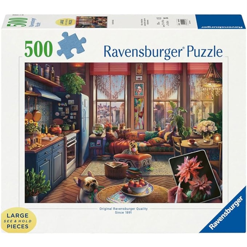 Ravensburger Cozy Boho Studio 500 Piece Large Format Jigsaw Puzzle Piece Count: 500 pieces. Format: Large format, meaning the pieces are larger and easier to handle. Brand: Ravensburger, a worldwide bestselling puzzle brand. Quality: Premium puzzling exper