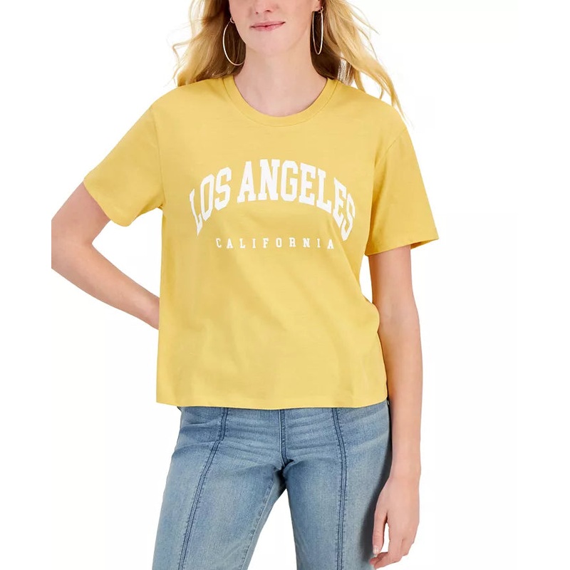 Rebellious One Women's Yellow LA Printed Crew Neck T-Shirt Capture the sunny spirit of the City of Angels with this juniors' graphic t-shirt from Rebellious One, a must-have for any laid-back closet. Product Features Approx. model height is 5'10" and she i