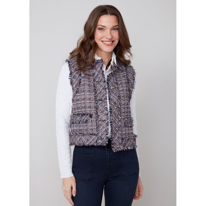 This Renuar Boucle Vest features a vibrant, colorful design highlighted by playful printed buttons. Its textured fabric adds stylish dimension, making it a perfect layering piece to brighten any outfit with subtle flair. Button front, print on buttons Flat