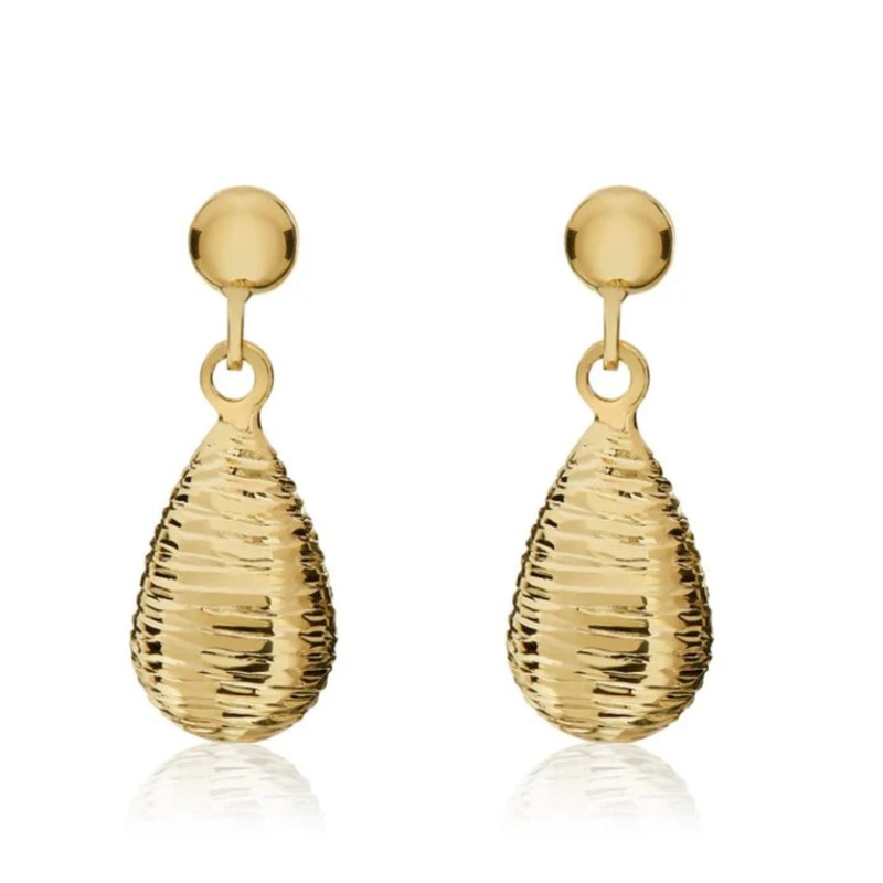 Beautiful drop shaped earrings with a faceted, ribbed pattern make these 9ct yellow gold earrings glisten from all angles. Measuring 20mm in length, these earrings are fitted with post and butterfly fittings.