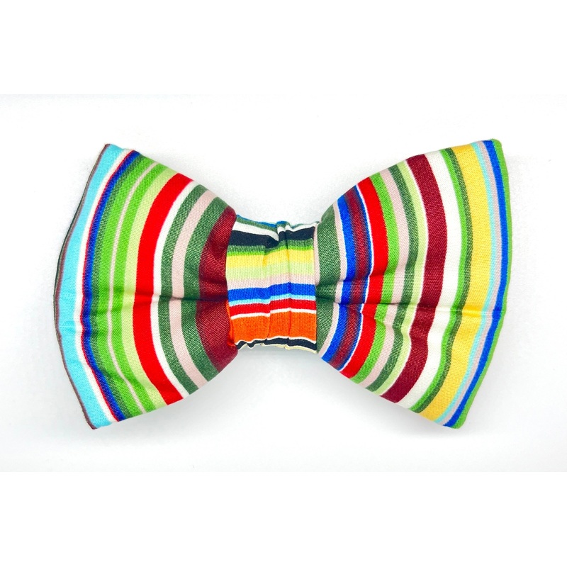 BlossomCo's Rock design is a distinctive pattern of multi-coloured stripes and this bowtie for dogs shows it off beautifully. Both the front and reverse sides of the bowtie are in the same multi-coloured stripes fabric and which is 100% cotton. Elastic loo