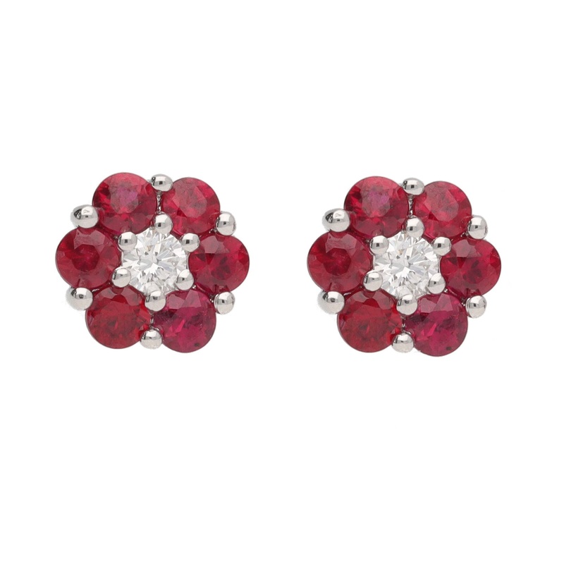 These beautiful earrings feature a central diamond (0.12ct) stone and surrounding vibrant rubies (0.96ct).