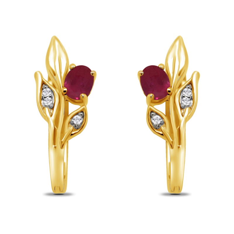 Stunning huggy-style hoop earrings with an oval cut ruby and diamond set leaves in 9ct yellow gold. Total diamond weight 0.03ct Enjoy peace of mind with Free Delivery on orders over 100 and our30 days return policyif you are not 100% satisfied with your or