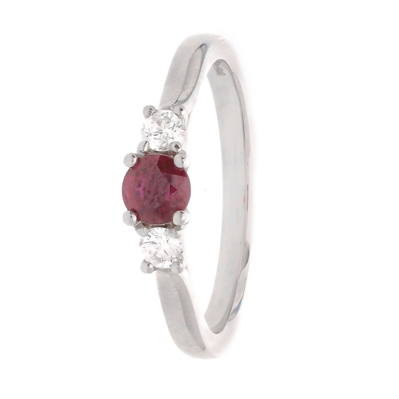 Classic triliogy ring featuring a deep red round cut ruby between two round brilliant cut diamonds in a platinum mount.