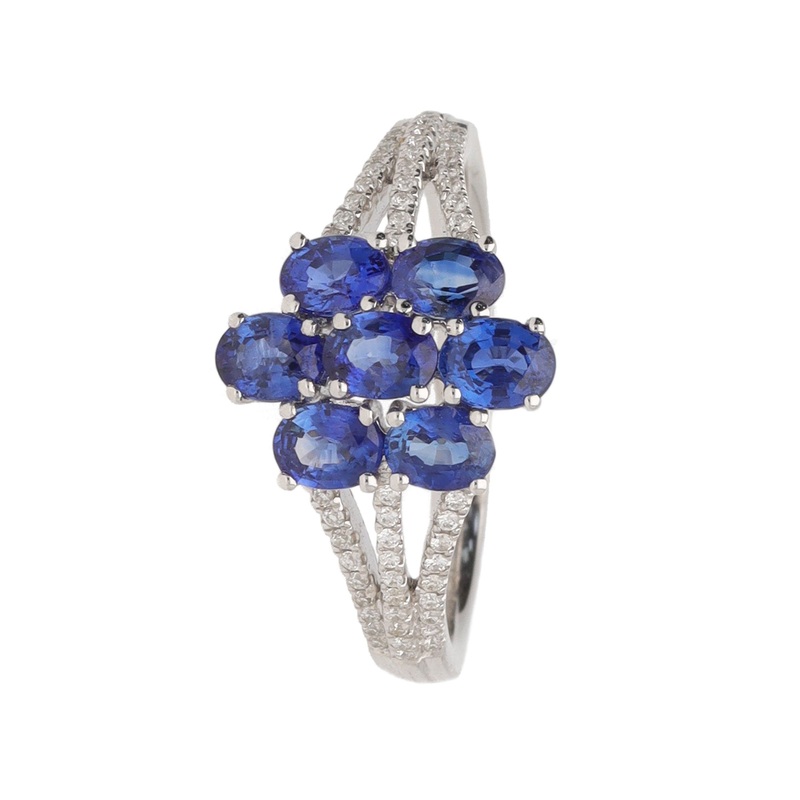 This exquisite ring features seven oval sapphires totalling 2.23 carats, elegantly set in 18ct white gold. Its split shoulders are adorned with 0.32 carats of sparkling diamonds, adding a touch of brilliance to the sophisticated design.