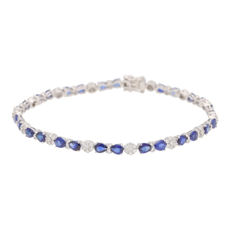 Featuring 4.48ct pear shaped blue sapphires and 1.10ct round brilliant cut diamonds in clusters, set in 18ct white gold. Bracelet length: 18cm.