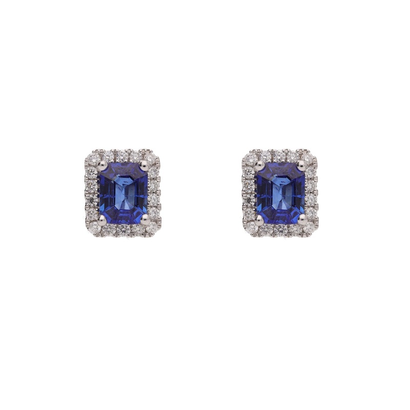 These elegant earrings feature a 1.02ct emerald cut sapphire at the center, surrounded by a sparkling halo of diamonds totalling 0.17ct. Set in polished 18ct white gold, they offer a timeless and refined look. Ideal for special occasions or adding a touch