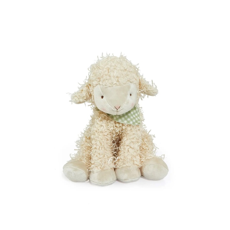 Scraggly furred Shep is ready for some shear fun! Yummy Oatmeal shaggy fur with sweet embroidered velour face to match. Handsome checked scarf in meadow green and cream.