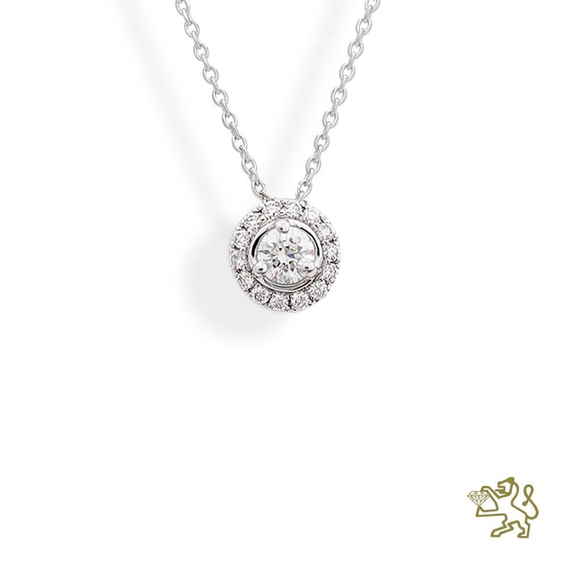 18ct White Gold Pendant Round brilliant cut diamond surrounded with smaller diamonds in 18ct white gold supplied with chain.