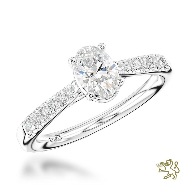 Platinum Solitaire Oval cut diamond engagement ring with scalloped set diamond shoulders. In a 4 claw setting all in platinum