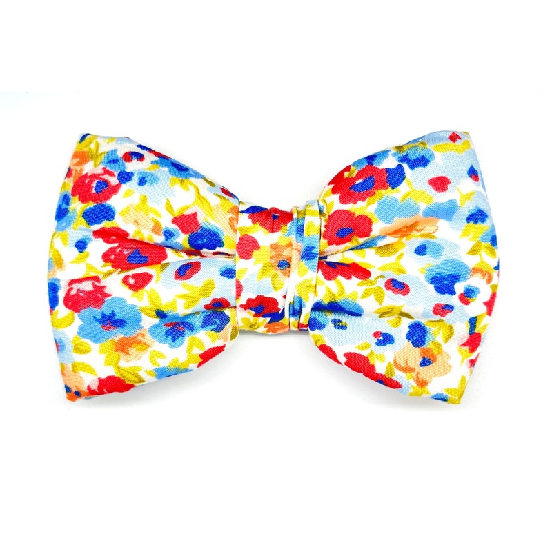 The Somerby dog bowtie is bright and floral and a great addition to any collar and is 100% cotton. Elastic loops on the reverse side allow the bowtie to easily slide onto any collar (preferably a BlossomCo one!) Size:Approximately 11cm wide (widest points)