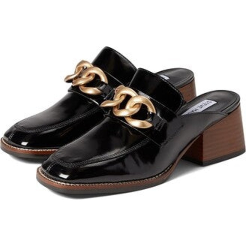 Steve Madden Women's Black Leather Lorie Casual Material: High-gloss black patent leather gives it a luxurious and dressy vibe Design: Open-back mule with a chunky block heel that appears wood-texturedstriking and stable Detailing: Bold gold chain embellis