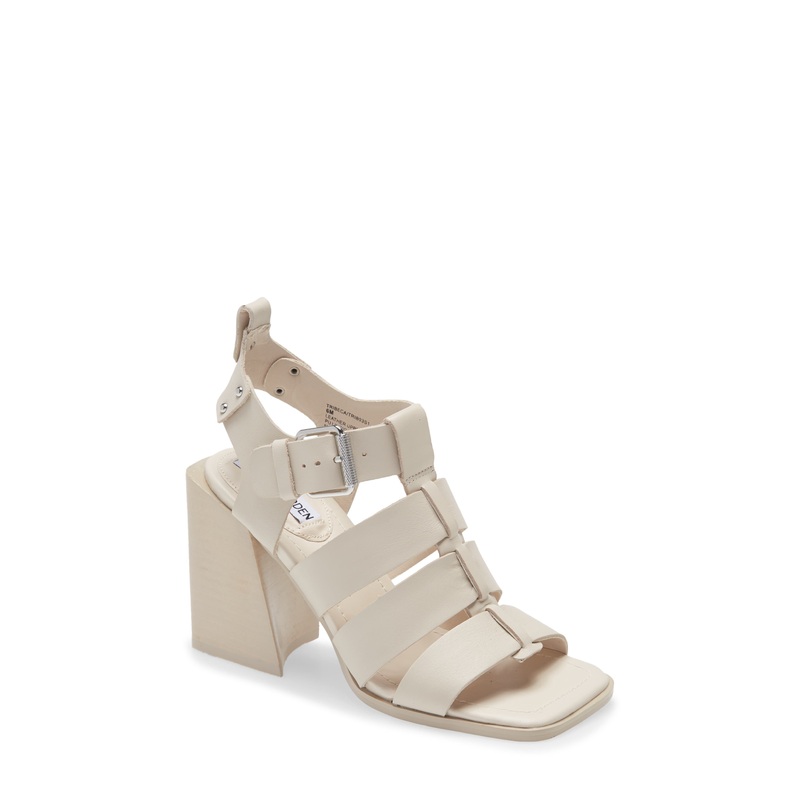 Steve Madden Women's Bone Tribeca Heels Smooth leather straps and an angular block heel intensify the modern appeal of this lofty statement sandal. True to size. 3 3/4" heel (size 8.5) Adjustable ankle strap with buckle closure Leather upper/synthetic lini