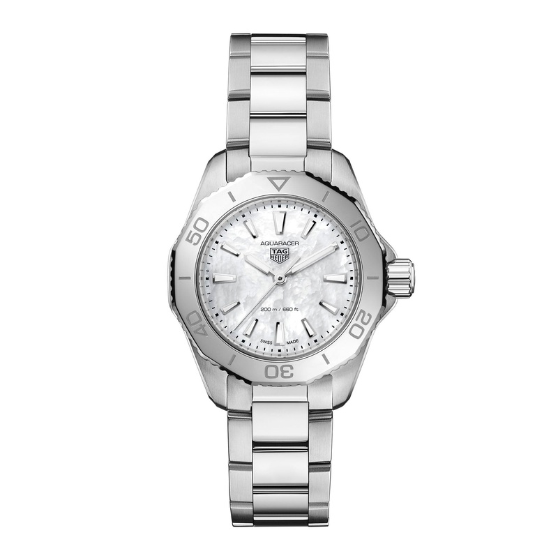 Ultra-versatile thanks to its enduring 30mm stainless steel case, this luxurious TAG Heuer Aquaracer shows a superb white mother-of-pearl dial with luminous rhodium-plated hands and indexes. Its tapered steel bracelet equipped with a steel folding clasp and double safety-push buttons brings comfort on the go.