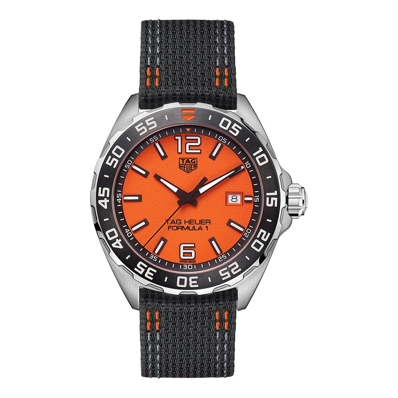An energetic 43mm 3 hands watch with a bold orange textured dial and white accents, matched by a black nylon strap with orange and grey touches. A tribute to the playful TAG Heuer Formula 1 models from the 80s and 90s.