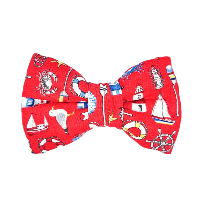 The Tenby dog bowtie by BlossomCo is all about the seaside and coas with its design of sailing yachts, beach huts, seagulls and shells and more on a gorgeous red background. ! Elastic loops on the reverse side allow the bowtie to easily slide onto any coll