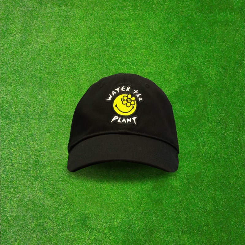 Water The Plant Thea cap in black. Water The Plant logo to the front & Water The Plant flower logo at the side. Baseball cap Colour: Black Yellow smiley label at the side