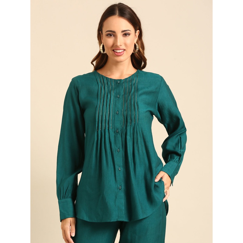 De Moza Women's Woven Top Peacock Green Pattern:Solid Color: Peacock Green Fit: Regular Fit Sleeve: Long Sleeve Length: Regular Style: Festive Wear Product Material: 100% Polyester These style elements includes a regular fit with half sleeve crop top so st