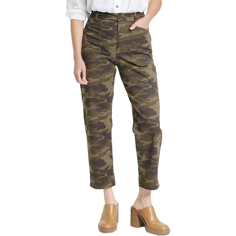 Universal Thread Women's Khaki Green High-Rise Barrel Leg Pants Product details Fabric type: 98% Cotton, 2% Spandex Closure type: Fly Button and Zipper Rise style: High Rise Leg style: Straight